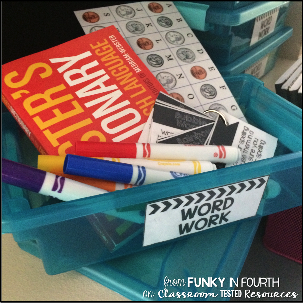 I found the small blue Sterilite tubs at Walmart for $0.99. I made a quick label for the outside so they wouldn't get confused with our writing tubs.My students use a composition notebook for all of their word work activities. This keeps it handy, organized and allows me to easily check to see if they worked hard during our Daily 5 time. I do NOT grade Daily 5 work, however I do award up to 5 extra credit participation points each week if students were on task all 5 days. My students keep their notebooks right next to our word work tubs! No more missing notebooks!! No more wasting time!